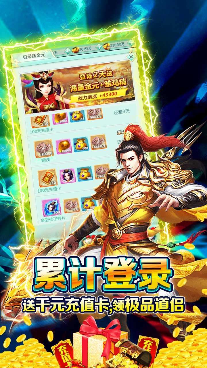 单日累充3000: 渊虹兵魂*5,兵魂碎片*300,神兵神石*400,红猴印章*40,随机属性丹*5000
