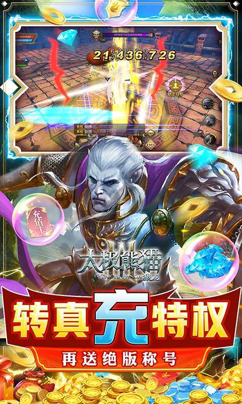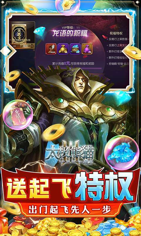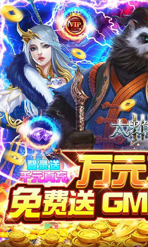 《太极熊猫3:猎龙-送万充GM》福利大幅提升,1000元真充卡,钻石*128888,绑定钻石*188888,紫色兑换券*1000,金币*2000w,“送万元真充卡”称号,会员11,三大特权震撼来袭,天天再送真充卡!让你玩到爱不释手!