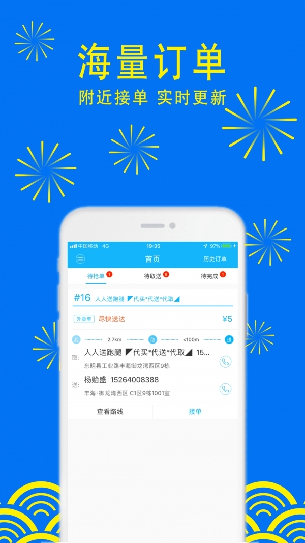 5. 24小时订单推送,任何时间都有订单,还有夜间补助;