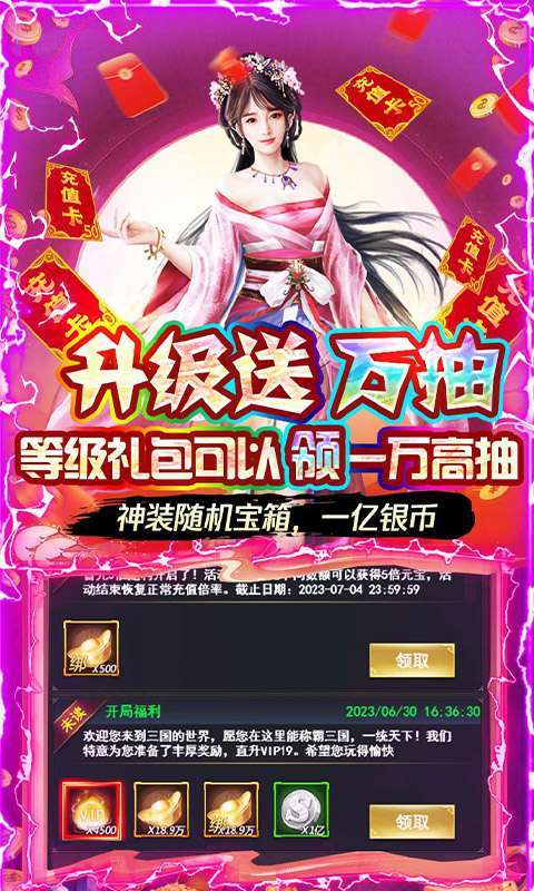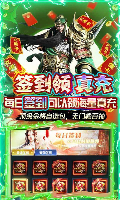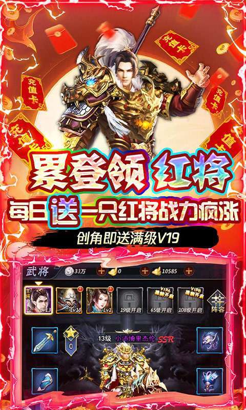 创角即送满级V19,顶级金将自选包,无门槛百抽,神装随机宝箱,一亿银币