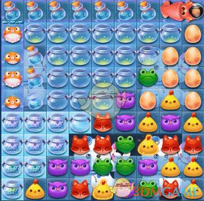 2、第二步:贴边打破空的魔法罐,待动物填充后贴边击打气鼓鱼,借助气鼓鱼炸裂收集魔法药水,点亮下方魔法罐。