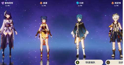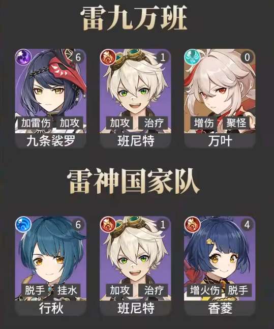 最后就是雷神国家队组合,雷神国家队的优势就是培养难度低,在各个场景都是简单好用,同时也有着不错的伤害。在这个队伍中,雷电将军变成了偏向于辅助c位,担任在队伍中充能作用。行秋和夜兰在队伍是水属性的后台输出位置,和雷电将军搭配可以造成元素反应伤害。而香菱在队伍中是唯一的火系输出,主要也要靠水活,或者火电来打出元素反应输出。班尼特同样是队伍中的奶爸角色,负责治疗队友和增加队伍整体的伤害,为队伍提供非常不错的帮助。