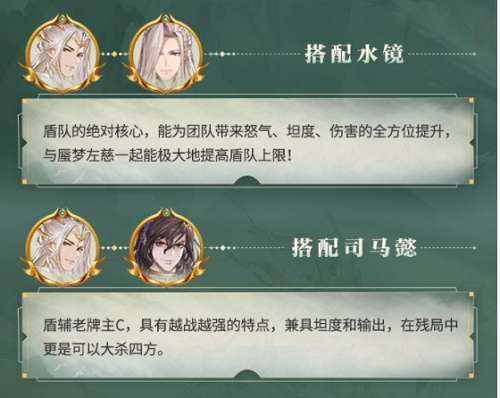 1.搭配水镜:盾队的绝对核心,能为团队带来怒气、坦度、伤害的全方位提升,与蜃梦左慈一起能极大地提高盾队上限!