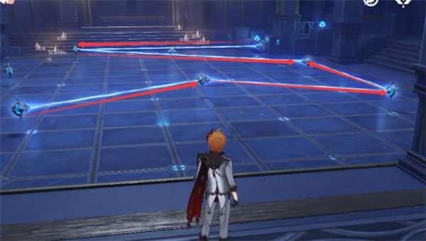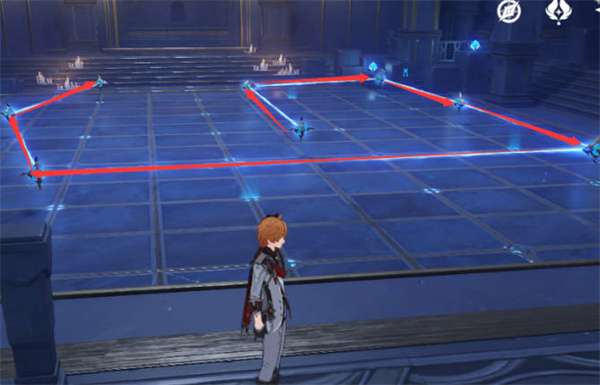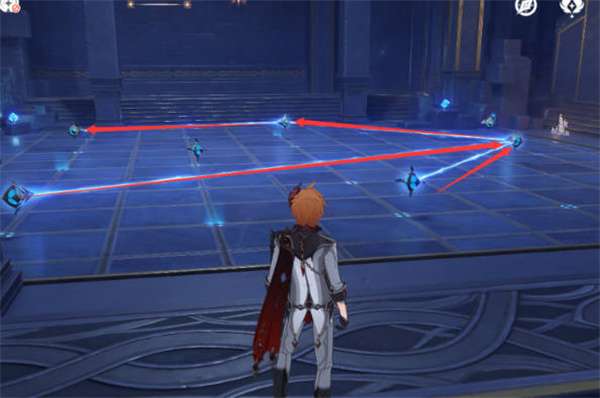 3:然后我们进入这个房间,左边是射线的要求,完成一个之后墙上图案就会改变的,所以只能展示地面射线方向,如图所示分别是三个图案,你们可以进行参考;