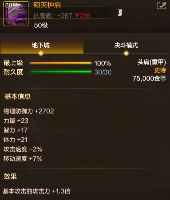 1.装备介绍 「陨灭护肩」 Lv.50 重甲 - 史诗 - 头肩 获取方式:制作、委托、深渊派对、道具 “质量越大,发出的力量就越强。大家都懂吧?——诺顿” 2.属性效果 【基本信息】 抗魔值:+267 物理防御力 +2702 力量+23 智力+17 体力+21 攻击速度-2% 移动速度+7% 【效果】 ① 基本攻击的攻击力 +1.3倍