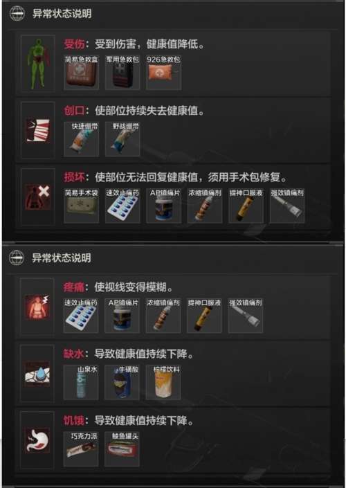 1.医疗包:回复血量,不同医疗包有着不同的治疗速度,回血速度,启用时间,总体恢复上限,减少水量能量以及是否能够治疗创口(流血)