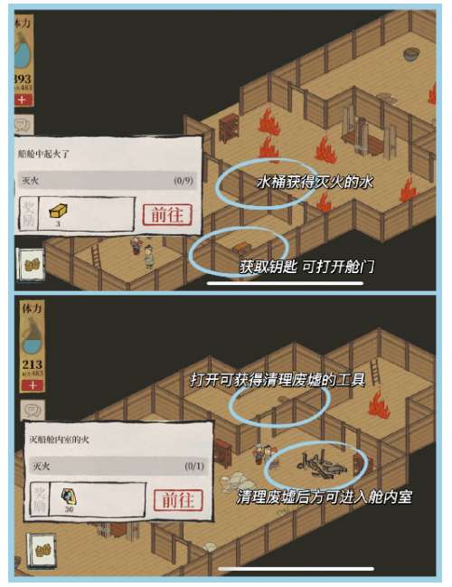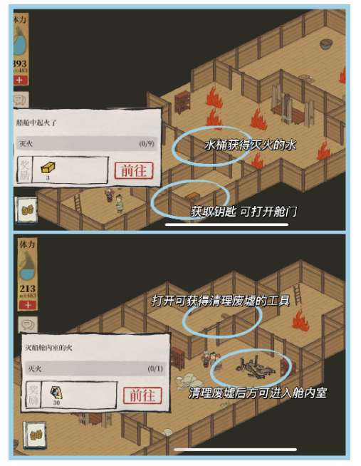 4、灭船舱室内火的顺序:找到藏钥匙的箱子获得钥匙→打开工具箱获得破坏废墟的工具→清理废墟→进入室内灭火