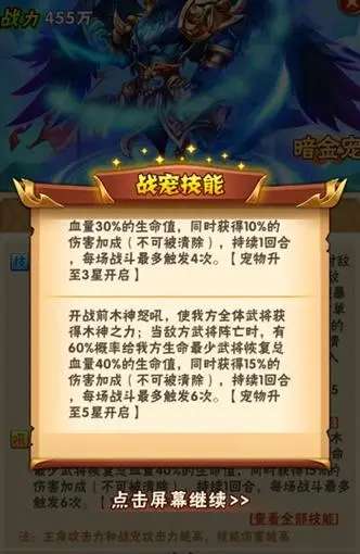技能升级:提升战宠技能等级,需要特定的技能书,技能等级越高,技能威力越强。