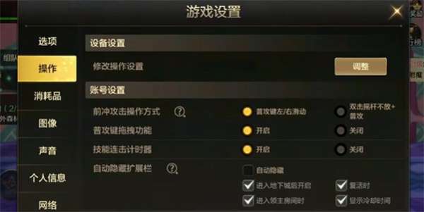 2、在游戏设置弹窗的左侧,找到【操作】,然后在设备设置中,点击调整。