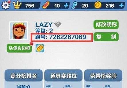 2、然后在个人信息页面找到下图中的跑号,点击右侧的复制就能获取地铁跑酷首充ID。