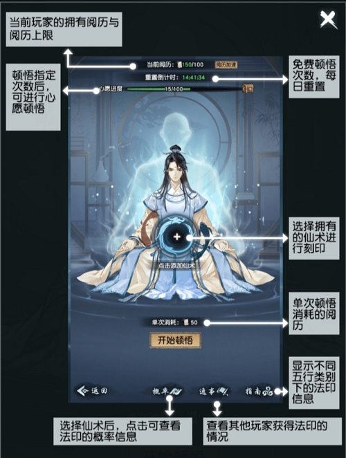 1、在游戏中达到一定境界时,便能自创仙术。玩家可以通过消耗阅历值,对已有的仙术刻印上属于自己的理解,对仙术附加各种不同的效果,同一仙术可以重复领悟,以领悟出自己想要的效果。