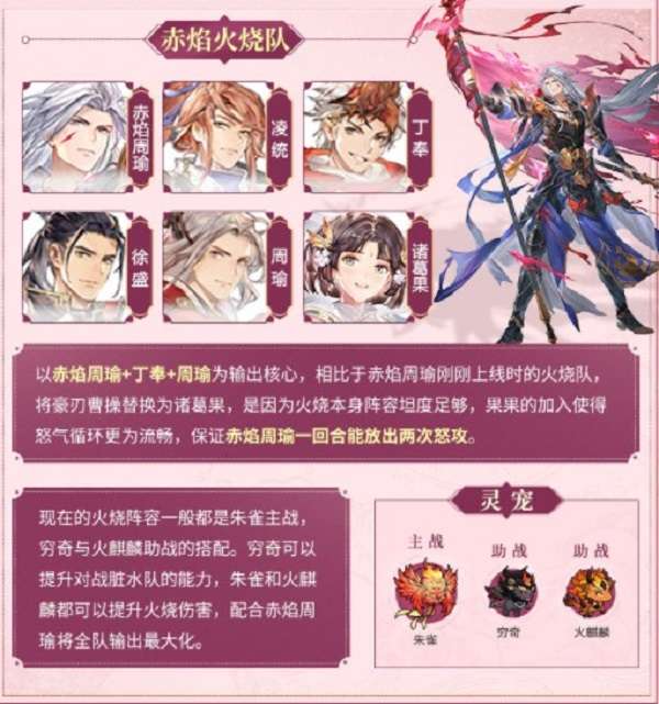 1.以赤焰周瑜+丁奉+周瑜为输出核心,相比于赤焰周瑜刚刚上线时的火烧队,将豪刃曹操替换为诸葛果,是因为火烧本身阵容坦度足够,果果的加入使得怒气循环更为流畅,保证赤焰周瑜一回合能放出两次怒攻。