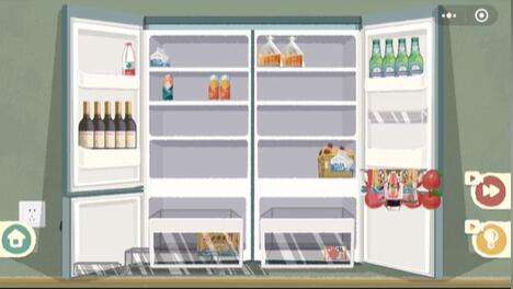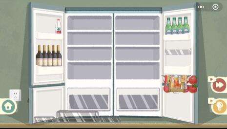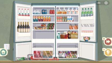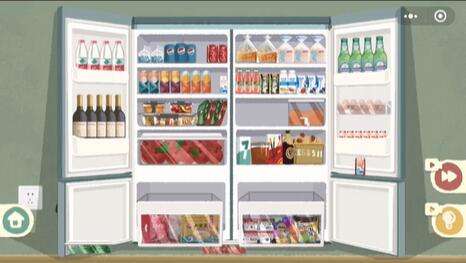 3、如图所示,冰箱右侧依次放入啤酒、鸡蛋、养乐多。