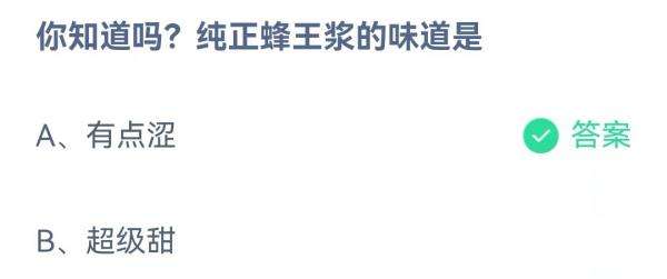 2022支付宝蚂蚁庄园8月3日的题目为:你知道吗纯正蜂王浆的味道是?有点涩还是超级甜?很多小伙伴可能还不太清楚正确答案是什么。下面小编就为大家带来了正确答案分享,感兴趣的小伙伴们快一起来看看吧!