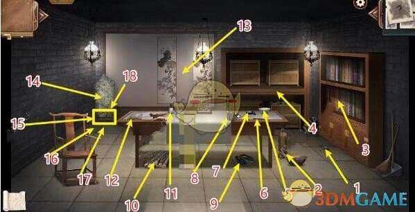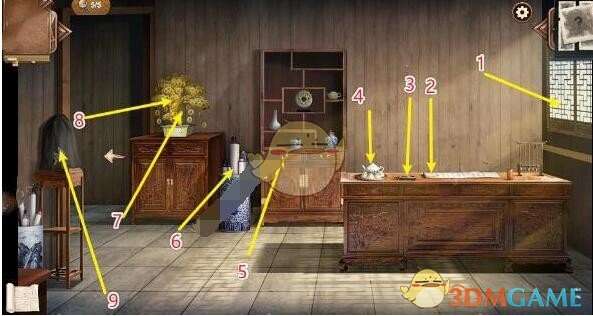 2、抽屉里的图谱、倒着的木椅、横梁上的圈套、房梁、博古斋序的牌匾、木榻、地上的脚印、博古斋序的大门、一串钥匙。