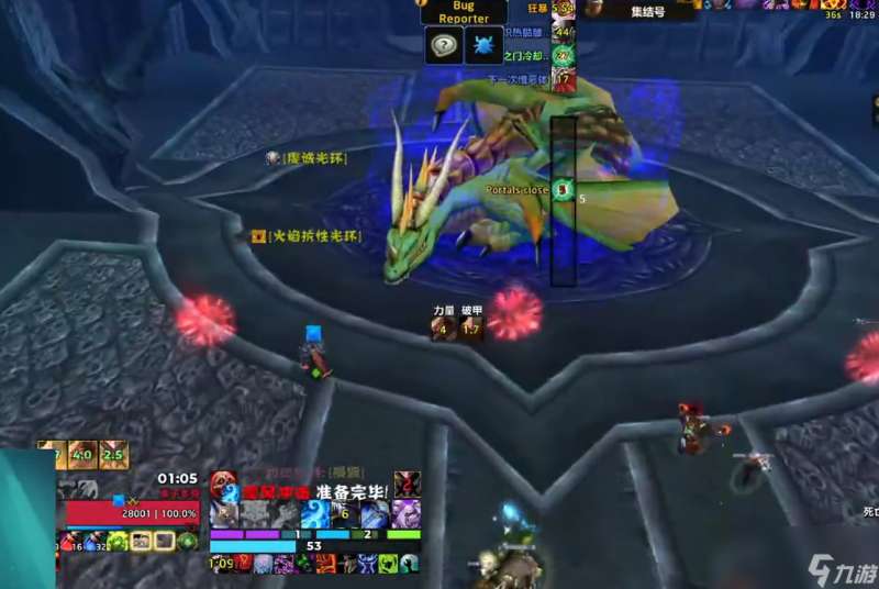 开打之前,大致分一下近战打镇压者的方向,两边各分一半就可以了。战位大致如图所示,安排风中瘸子的猎人、安排进门的治疗,同时呢给带位置的治疗一个标记、安排法师给绿龙保持魔法增效的buff。一行大团,DPS的优先级开打之后团长只需要报场外刷新的怪的位置方向就可以了,剩下的交给他们自己发挥。嗜血根据情况开,观察boss的血量80%以上,或者进门的治疗组有两到三个叠到了30加以上的层数就可以开了。