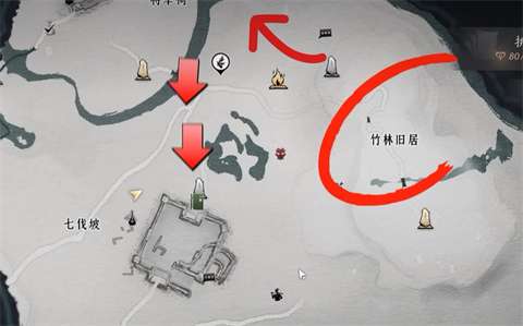 打开地图开始我们从竹林旧区出发,然后往西北方向开始走,一直坐主线走到将军祠这边。