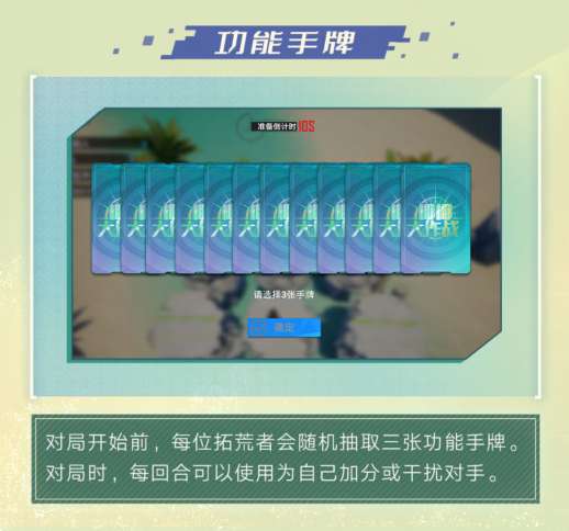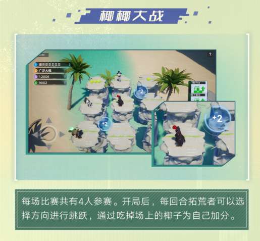 拓荒者可以在「椰椰大作战」玩法中体验立体平台的联机比拼,利用自身策略或功能卡牌,让自己得到更高的分值,取得胜利吧!