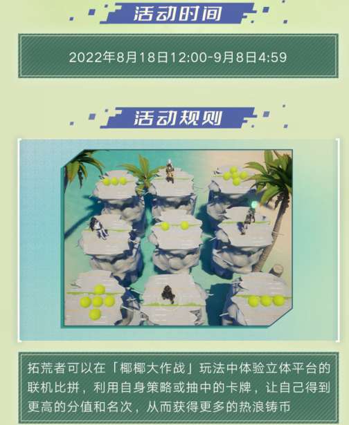 幻塔椰椰大作战活动怎么玩?椰椰大作战是幻塔近期上线的一个活动玩法,椰椰大作战是一种pvp类型的卡牌策略活动,有小伙伴想知道椰椰大作战怎么玩,下面为大家介绍一下。