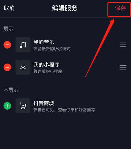 4、随后,可以看到抖音商城在不展示页面,点击右上角保存。