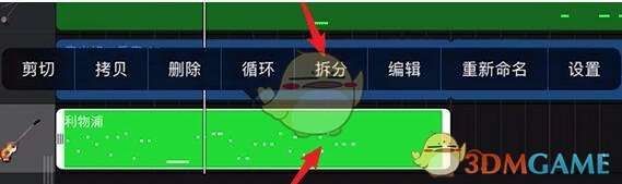 1、打开库乐队,点击乐曲,点击要裁剪的乐曲片段两次,再点击【拆分】;