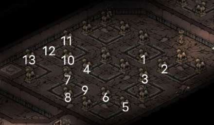 走到(10,10)机关残骸【翻找】直到出现石砖,踩下石砖,出现石柱,填充石块然后对话转动圆环就可以开始解谜了。