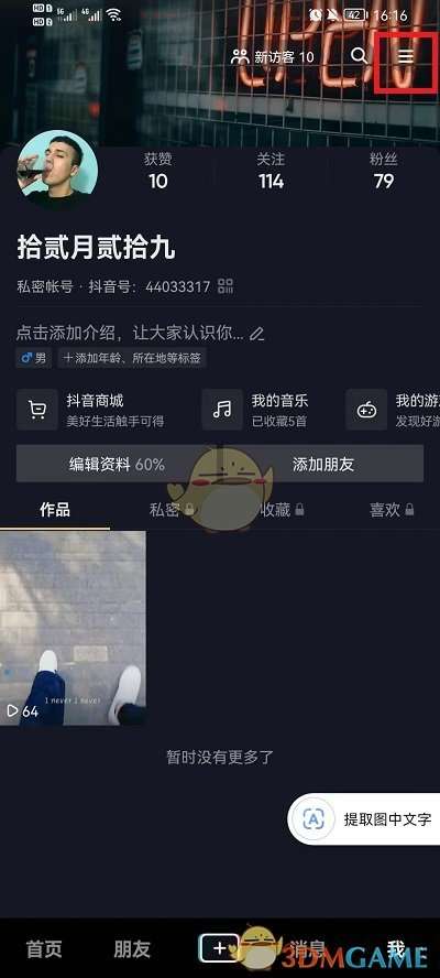 1、进入个人主页,点击右上角三横线。