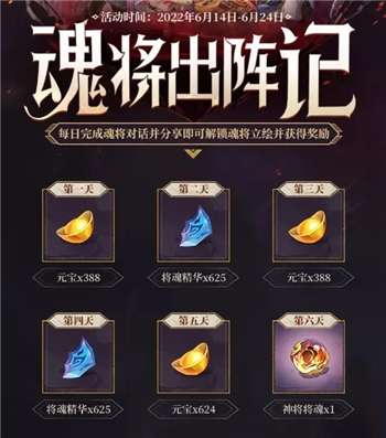 3、分享魂将记忆立绘即可获得当日奖励,奖励有元宝、将魂精华、神将将魂,每日完成对话并分享后可获得的对应奖励如下。