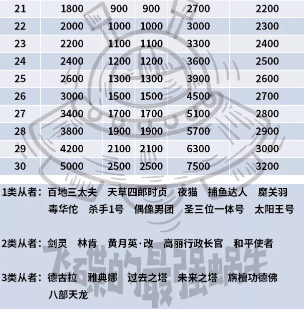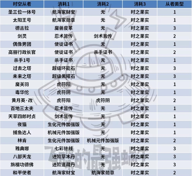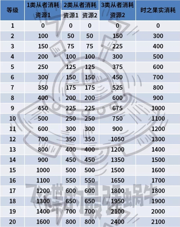 从者只有1个天赋,初始1级,最高30级。按照消耗的数量共分为3种类型,消耗的『时之果实』数量全部固定,详情见下表。