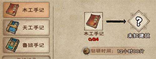 7.手记可以钻研出对应颜色的随机建筑,木工手记对应绿色,天工手记对应蓝色,鲁班手记对应紫色,橙色只有通过氪金礼包来获取。