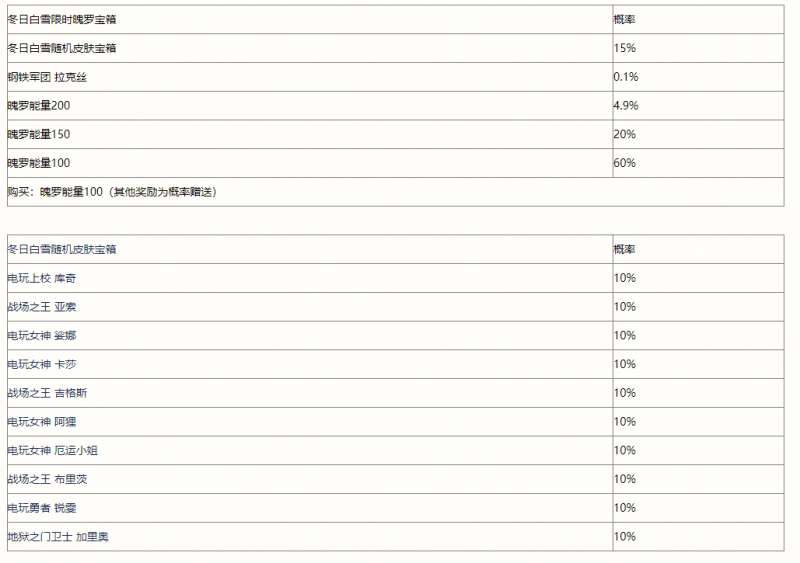 冬日白雪限时魄罗宝箱,20次至少掉落2个冬日白雪随机皮肤宝箱或钢铁军团 拉克丝,冬日白雪随机皮肤宝箱包含电玩系列皮肤和地狱之门卫士 加里奥。