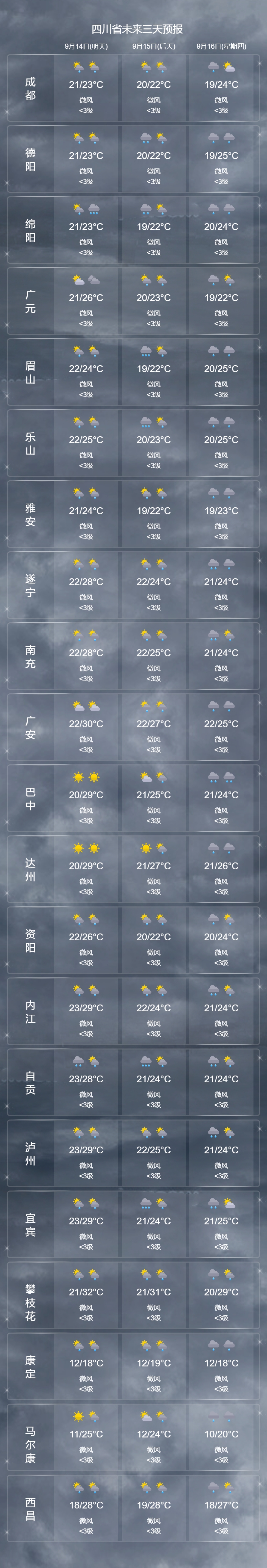 据四川气象台未来24小时天气预报,14日晚上到15日白天阴天有小雨到中雨,个别地方暴雨,气温19~25℃。