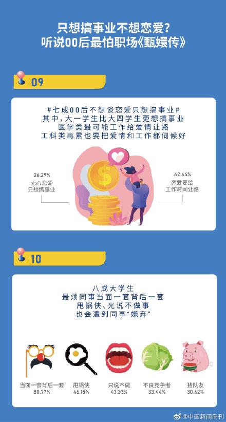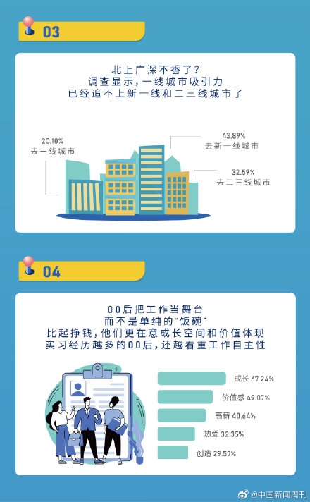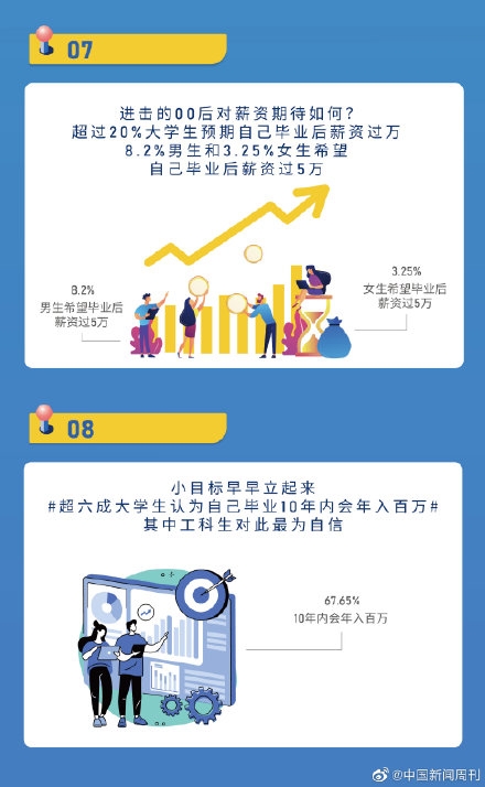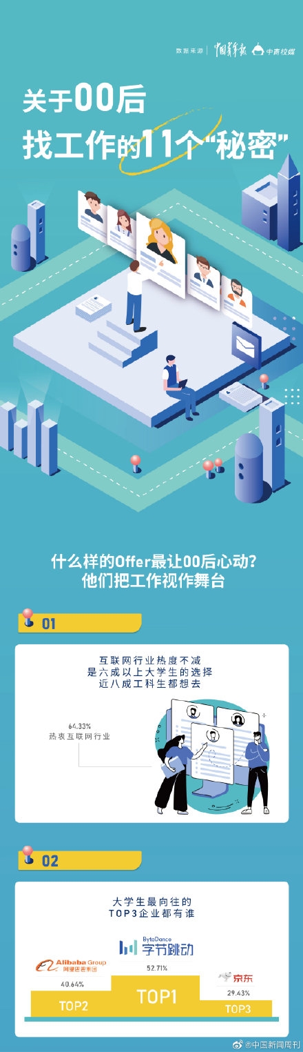 中青校媒的调查结果显示,比起高薪,00后找第一份工作更看重成长和价值感。此外,64.33%大学生希望毕业后能进入互联网行业。#7成00后嘴上无所谓其实偷偷努力# 他们给自己的职场定位主要是坚韧的“勇敢牛牛”和能干的职场“秀儿”。在工作这件事上,00后是认真的,#7成00后不想谈恋爱只想搞事业# 67.65%大学生评估自己10年内会年薪百万。想知道更多00后求职那些事?