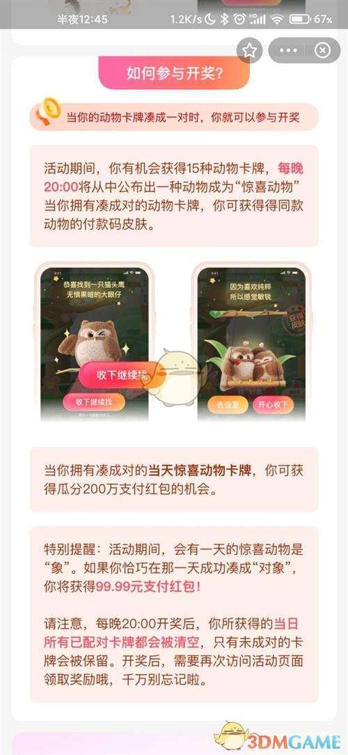 当你拥有凑成对的当天惊喜动物卡牌,你可获得瓜分200万支付红包的机会。