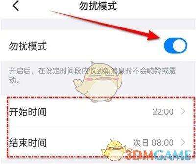 5、当开关按钮变成彩色时下面会出现设置勿扰模式的开始时间和结束时间,设置好后在使用钉钉时,到了设定的时间段内收到新消息时就不会有响铃或震动提醒了。