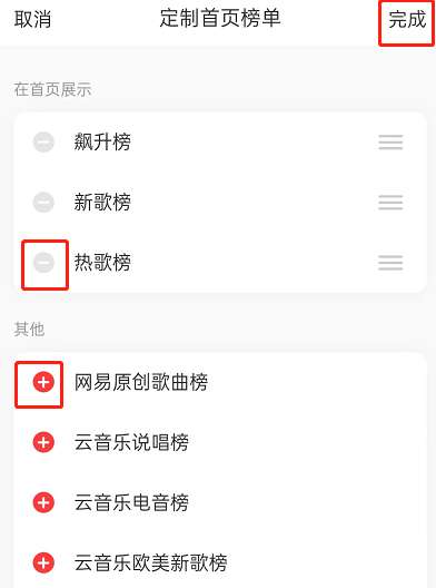3、点击减号删除榜单,点击加号添加榜单,点击右上角完成即可。