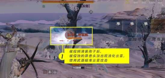 将获得的清菌孢子装配到武器快捷栏,对准云蚀异兽【近距离】投掷,云兽头顶会出现一团云雾,瞄准云雾集火后,云魅怪就会从异兽身上脱离下来啦,只要击杀它们就可以获得任务道具【凝云】。