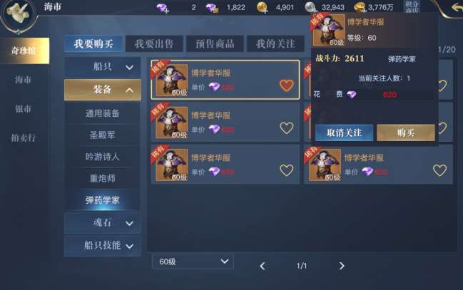(6)关注商品:在架以及预售期的船只及装备可点击关注, 一个角色最多同时关注20件珍品商品。