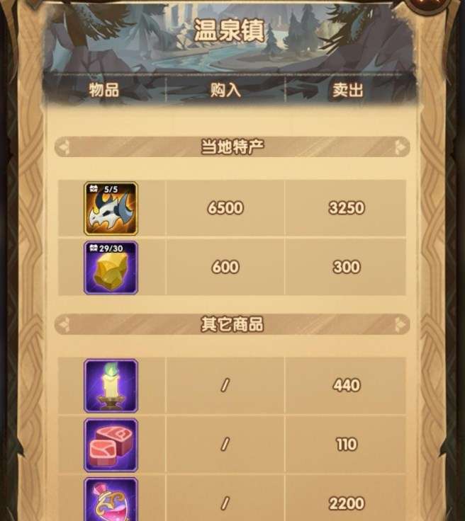 这里要教你看懂上下两张图,以温泉镇的硫磺石为例,在当地买完再卖,只能5折出售,但是贩运到里尔镇呢,价格就变660了,也就是1块能赚60。