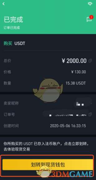 4、卖家放币后,交易成功。您可以点击“划转到币币账户”,将数字资产划转至币币交易账户。