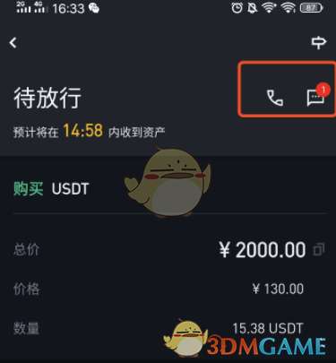 6、如果点击“我已完成付款”2分钟后,您还没有收到币,可以点击右上角的电话标志或者chat聊天联系卖家。