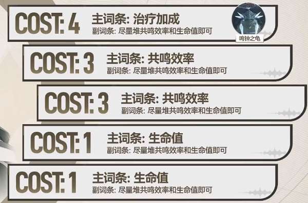 声骸主词条方面,cost4选择治疗加成,cost3选择共鸣效率,cost1选择生命值。