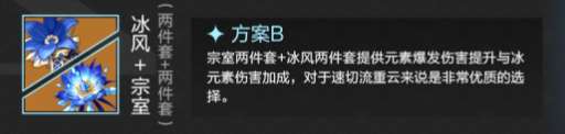 宗室两件套+冰两件套提供元素爆发伤害提升与冰元素伤害加成,对于速切流重云来说是非常优质的选择。