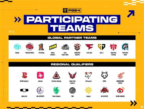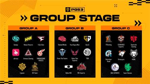 通过各个区域性赛事的选拔,共计24支战队成功晋级本次PGS3,所有战队会被分成A、B、C三个小组内,并通过3天的循环赛,角出前16名晋级总决赛。以下是进入总决赛的16支战队名单:TWIS战队、CES战队、NH战队、Soniqs战队、TSM战队、EA战队、VLTH战队、GNL战队、KDF战队、PeR战队、HOWL战队、KRG战队、FaZe战队、17Gaming战队、NAVI战队、WBG战队。