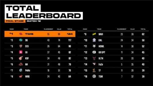 总决赛第二天,其他战队也不甘落后,第一天势头正猛的NAVI在第一把比赛中就被止步于第六阶段,最后则是由EA战队接连收下VLTH和SQ双强,成功吃鸡。而TWIS则是继续沿续了第一把的势头,一套手雷雷轰炸配合枪法用到飞起,不仅在第2把接连拿下HOWL、17战队成功吃鸡,在后续的第6把上,也通过多打一,拿下KDF再下一城。