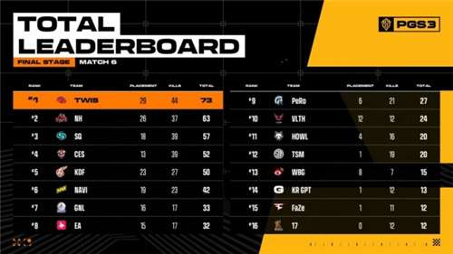 来自PCL赛区的NH战队在第一日的对局中,则是表现出了老牌劲旅的风范,虽然前面几把未能挺到最后,不过在第4把和第6把,NH战队都力克强敌,拿下双杀,冲到了首日榜单的第2名,TWIS战队则是以44个击杀,和73的总积分排暂列第一名。