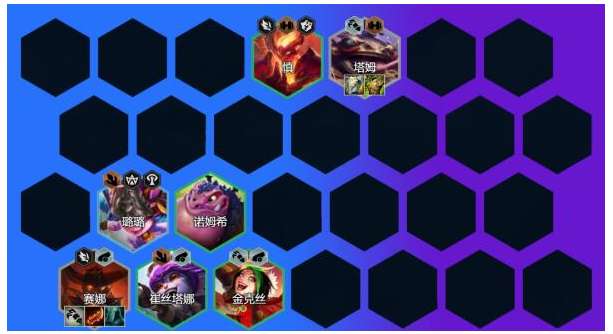 4-5或5-1升8人口,大搜卡,找到迭嘉2星,如果这时候驯龙诺姆希养的比较高可不下,如果较差就下掉上亚索,在亚索没来之前可用努努或永恩过渡。在全员2星后就可升级9人口挂巴德或开4格斗阵容大成。