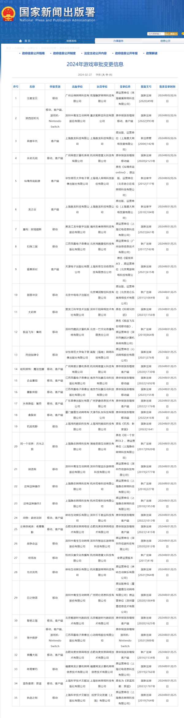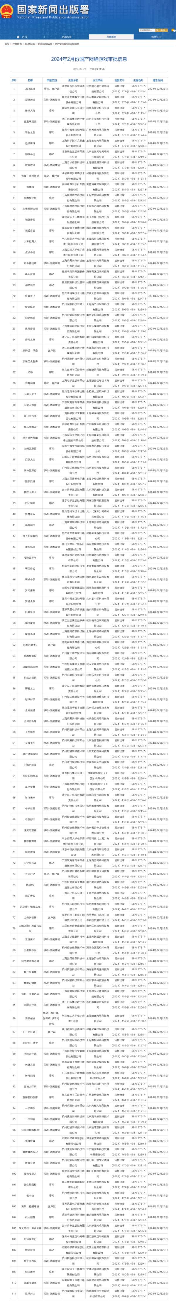2月27日,国家新闻出版署发布了2024年2月国产网络游戏审批信息以及2024年游戏审批变更信息。其中包括《黑神话:悟空》在内的共111款游戏获批,另有35款游戏对版号进行了变更。