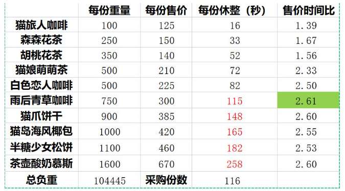 2)以雨后青草咖啡为例。休整时间是115秒,所以NPC花90秒吃完,还要等小车再休整25秒,即115秒才卖出一杯雨后青草咖啡,所以求售价时间比时,以实际休整时间计算。