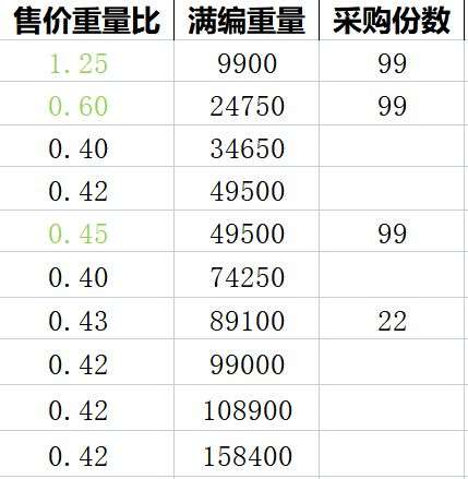 计算后,得到第二张图的第一列数据,即售价重量比。